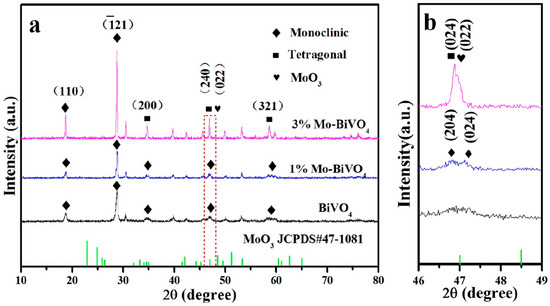 (a) XRD patterns of undoped BiVO4, 1% Mo-BiVO4 and 3% Mo-BiVO4; (b) the magnified XRD peaks at 47° of all samples.