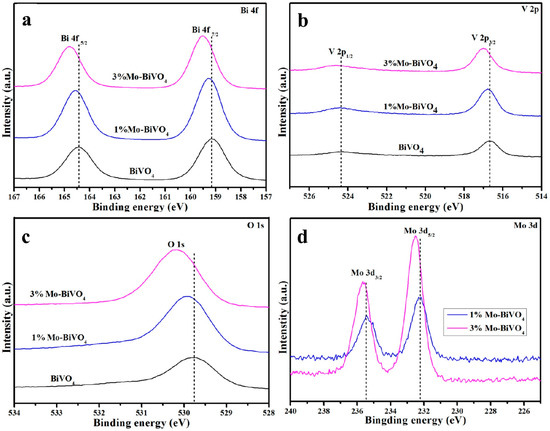 High-resolution XPS spectra of undoped BiVO4, 1% Mo-BiVO4 and 3% Mo-BiVO4: (a) Bi 4f; (b) V 2p; (c) O 1s; and (d) Mo 3d.