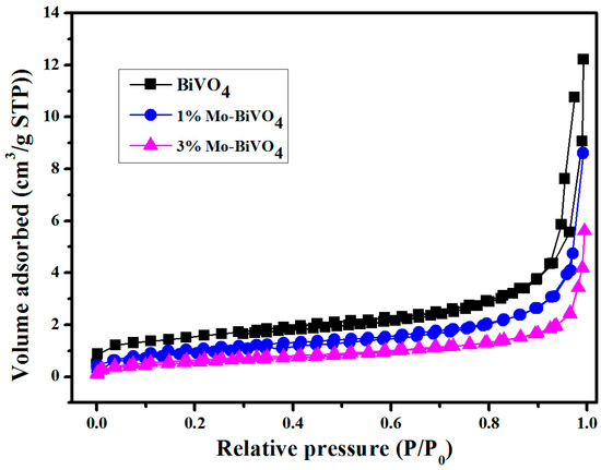 N2 adsorption–desorption isotherms of BiVO4, 1% Mo-BiVO4 and 3% Mo-BiVO4.