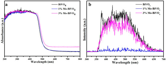 The UV-vis diffuse reflectance spectra (a); and PL spectra (b) of undoped BiVO4, 1% Mo-BiVO4 and 3% Mo-BiVO4.