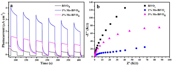 Finally, the photoelectrochemical behaviors of undoped BiVO4, 1% Mo-BiVO4 and 3% Mo-BiVO4 samples were performed. The photocurrent response results of three samples set applied potential as 0 are shown in Figure 7a. Obviously, 1% Mo-BiVO4 exhibits higher photocurrent intensity than pure BiVO4 and 3% Mo-BiVO4. The photocurrent of 1% Mo-BiVO4 is 3.5 times and 2.3 times higher than those of undoped BiVO4 and 3% Mo-BiVO4, indicating that lower concentration of Mo doped BiVO4 can obtain stronger ability in separation and transfer of photogenerated electron–hole pairs comparing with undoped or higher Mo doped BiVO4. Electronic impedance spectroscopy (EIS) is another important means to characterize the ability of charge transfer. As shown in Figure 7b, the order of arc radii is as follows: 1% Mo-BiVO4 > 3% Mo-BiVO4 > undoped BiVO4. It is well-known that a lower arc radius implies a higher efficient charge carrier transfer at the electrolyte and photoanode interface [26]. Therefore, 1% Mo-BiVO4 shows the strongest separation efficiency of electron–hole pairs, which is a key factor for high photocatalytic photocatalyst.