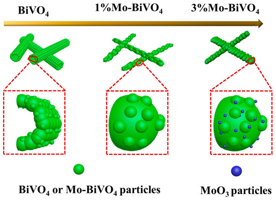 Based on the above analysis, we proposed a mechanism to explain the formation of the Mo-BiVO4, as shown in Scheme 1. Bare BiVO4 consists of homogeneous dispersed sol-gel particles with many pores. With a small amount of Mo ions doped into BiVO4 lattices, the BiVO4 particles become bigger while the pores disappear. No lattice fringe about Mo compounds can be detected, indicating the formation of solid solution. When the doping concentration reaches 3%, the saturated Mo ions preferably form MoO3 particles near the BiVO4 surface.