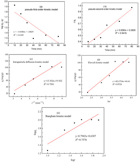 - Febrianto, J.; Kosasih, A.N.; Sunarso, J.; Ju, Y.H.; Indraswati, N.; Ismadji, S. Equilibrium and kinetic studies in adsorption of heavy metals using biosorbent: A summary of recent studies. J. Hazard. Mater. 2009, 162, 616–645. [Google Scholar] [CrossRef] [PubMed]