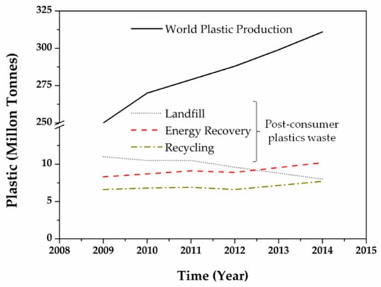 Progress of world plastic production and annual average of plastics post-consumer waste generation (data obtained from Plastics Europe [10]).