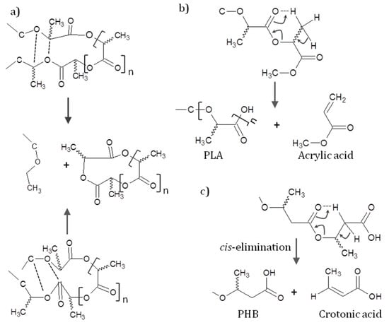Non-radical thermal degradation of PLA: (a) trans-esterification; (b) cis-elimination (adapted from Kopinke et al. [101]); and (c) non-radical thermal degradation of PHB cis-elimination (adapted from Aoyagi et al. [102]).