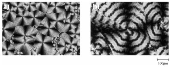 Optical micrographs of PLA spherulites in: (a) neat PLA; and (b) PLA-PHB (75:25) blend crystallized at 130 °C from the melt (200 °C). Reprinted with permission from [54].