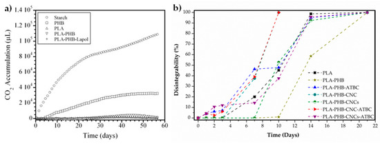 (a) Carbon dioxide evolution of the neat PLA, neat PHB, neat Starch (control), PLA-PHB and PLA-PHB-Lapol7% blends as a function of time. Reprinted with permission from [66]; (b) Disintegrability degree of neat PLA and PLA-PHB based films under composting conditions as a function of time. Film thickness: 20–30 μm. Adapted from [5,28].