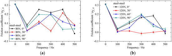 Effect of in-plane vibration on frictional coefficient between alloyed steel and steel. (a) Exciting force equals to 80N; (b) exciting force equals to 120N; (c) exciting force equals to 160N and (d) exciting force equals to 200N.