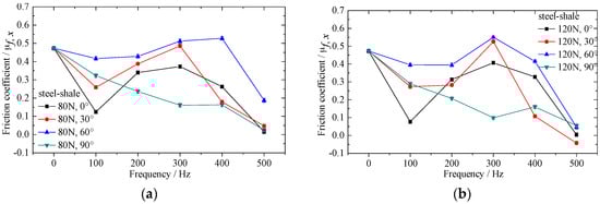 Effect of in-plane vibration on frictional coefficient between alloyed steel and shale. (a) Exciting force equals to 80N; (b) exciting force equals to 120N; (c) exciting force equals to 160N and (d) exciting force equals to 200N.