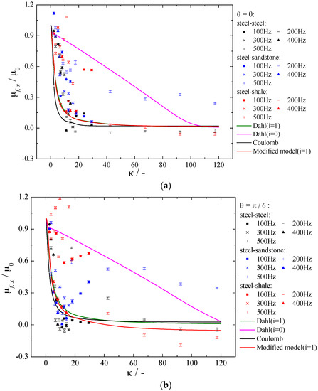 In order to verify the capacity of modified model in predicting the frictional coefficient under in-plane vibration conditions, we compared the calculation results of Coulomb model, Dahl model and the modified model proposed in this paper with the experimental results in Section 2 (see Figure 12). The parameters used in models include . From Figure 12, the frictional coefficient ratio calculated by models of Coulomb and Dahl (i = 1) quickly decreases at first, and then reaches a plateau while the frictional coefficient ratio calculated by model of Dahl (i = 0) appears approximately linear decline with the increase of velocity ratio. Dahl model (i = 0) is less consistent with the experimental value than Dahl model (i = 1) because the offset of asperities calculated by Equation (15) when i = 0 is larger than i = 1, which will result in larger frictional coefficient. There is a critical value for . Dahl model (i = 1) has lower value than Coulomb model when is higher than this critical value. This critical values are 70, 45, 23, and 25 for , , = , and , respectively. The results calculated by the modified model have similar tendency with Coulomb model and Dahl model (i = 1) in general. The calculation results of modified model and Dahl model (i = 1) are the same when . With the increasing of vibration direction angle, the calculated results of modified model are between Coulomb model and Dahl model (i = 1) under lower velocity ratio region, and are lower than results of Coulomb model and Dahl model (i = 1) under higher velocity ratio region. The consideration of orientation angle of contact patches in modified model make the frictional coefficient more sensitive to velocity ratio . Compared with alloyed steel, frictional coefficient of rock materials are harder to be predicted, especially when the applied in-plane vibration is intense.