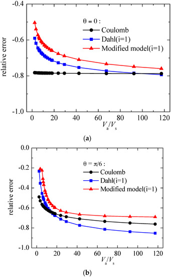 Relative error of modified model compared with Coulomb and Dahl models. (a) ; (b) ; (c) and (d) .