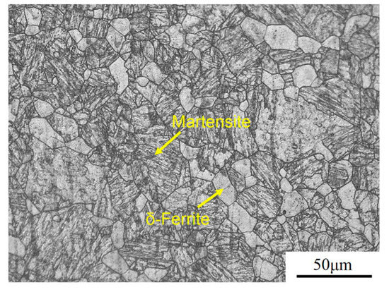 The experimental steel investigated in this research is a 9% Cr RAFM steel, and its chemical composition is given in Table 1. Figure 1 displays the optical micrograph of the RAFM steel prior to the normalizing treatment. The initial material was machined from an ingot subjected to casting and forging processing. After casting and forging processing, the microstructure of the RAFM steel consisted of martensite and small amount of δ-ferrite. The δ-ferrite may have originated from the casting treatment, and the fraction of the δ-ferrite phase fraction is about 18%.