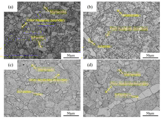 The growth of austenite grains and the dissolution of precipitates would affect the Vickers hardness of martensite. When the austenitizing temperature increases from 900 to 1100 °C, both the carbide dissolution and austenite growth occur. The precipitate dissolution would increase the amount of carbon saturated in martensite, resulting in the increase in hardness of martensite (291 to 382 Hv). The elements dissolved from precipitates, such as Mo, V, and Cr, would be beneficial to solution strengthening [30]. However, the increase of prior austenite grain size would lead to the increase of the block size in lath martensite [31,32]. The increase of block size would be disadvantageous to sub-boundary hardening, which the block boundaries result in Reference [33]. In addition, the hardness of martensite is essentially caused by the dislocation motion in martensite. The movement of dislocation motion is hindered by the block boundary. The larger block size implies that the number of block boundaries would decrease, which also is disadvantageous to the increase in hardness of martensite [34,35]. When the austenitizing temperature increases from 900 to 1100 °C, the precipitate dissolution on the hardness of martensite is dominated, thus the hardness of martensite is increased. While the temperature reaches 1200 °C, the effect of austenite growth on the hardness of martensite is predominant, and the hardness decreases. Besides, the formation of a considerable amount of δ-ferrite would also consume the solution strengthening elements, thus decreasing the hardness of martensite.