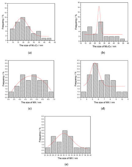 (a,b) The normal distribution of M23C6 precipitates size, holding at 900 and 1000 °C for 400 s; (c–e) The normal distribution of MX precipitates size, holding at 900, 1000, and 1100 °C for 400 s. The red curve represents the normal distribution curve of carbide size.