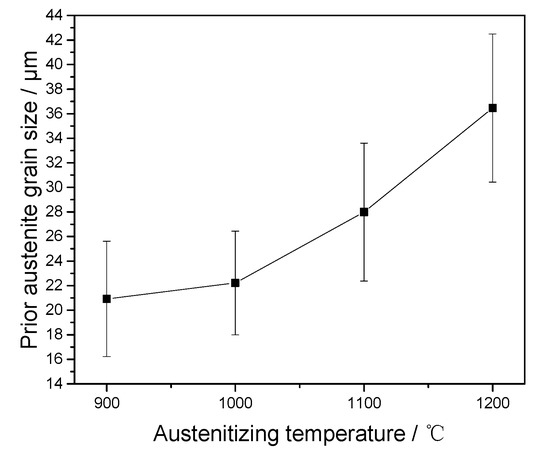 Previous studies [10,11,12,13,14] usually only considered the effect of one type of precipitate on austenite growth, while in this work, two types of carbides with different sizes and thermal stabilities are considered. The austenite grain sizes in this study were determined with the linear intercept method. Figure 6 displays the average sizes of prior austenite grains at each austenitizing temperature. As the austenitizing temperature increases from 900 to 1200 °C, the austenite grain sizes are respectively determined as 20.92, 22.22, 27.99, and 36.46 μm. The average sizes of prior austenite grains under the different austenitizing temperatures increase as the austenitizing temperature increases, which can be explained as the prior austenite boundary mobility increasing as the austenitizing temperature increases.