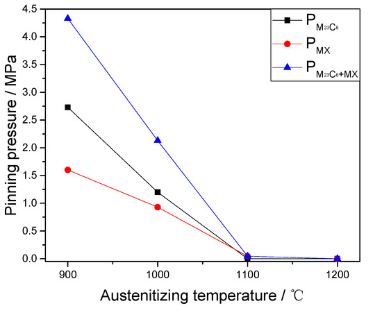 Replacing the average radius and volume fraction of the M23C6 and MX precipitates into Equations (3) and (5), the pinning pressure ( and ) on the grain boundaries at different austenitizing temperatures can be obtained, as shown in Figure 7. The pinning pressure decreases with the increase of the austenitizing temperature. This is caused by the reduction in the number of pinning positions resulting from dissolution of precipitates. According to Equation (3), the increase of precipitates size due to coarsening is also an important factor. In addition, from 900 to 1000 °C, the reduction of the pinning pressure ( MPa) caused by the M23C6 precipitates is more than that ( MPa) caused by the MX precipitates, due to the lower thermal stability of M23C6 precipitates. When the austenitizing temperature is in the range of 1000–1100 °C, the entire dissolution of M23C6 precipitates results in the disappearance of the pinning pressure . Meanwhile, the serious coarsening and dissolution of MX precipitates lead to a significant decrease of the pinning pressure , from 0.93 to 0.045 MPa. Then, the complete dissolution of MX precipitates also causes the decrease of the pinning pressure at 1200 °C.