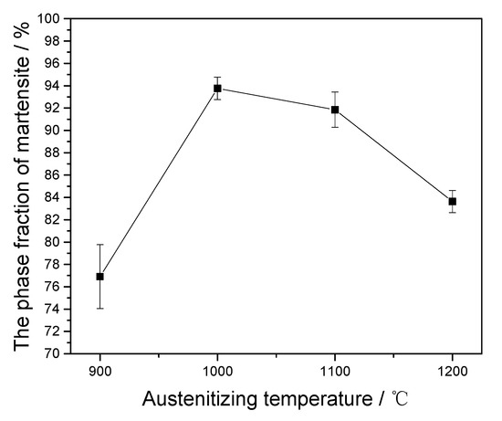The average phase fraction of martensite under different austenitizing temperatures is illustrated in Figure 8. In this work, the martensite phase fractions in the final microstructures are considered as the austenite phase fractions at high temperatures. The average phase fraction of austenite increases first and then decreases as the austenitizing temperature increases. When the austenitizing temperature is 900 °C, the austenite phase fraction is only 76.91%. As shown in the Figure 1, some amount of δ-ferrite already exists in the original microstructure of the RFAM steel in this study. On the other hand, the austenitizing temperature of 900 °C is just at the α/γ two-phase region [29]. This indicates that the austenitizing of RAFM steel is incomplete at 900 °C. Some amount of α-ferrite may remain after cooling. As shown in Figure 4, the Vickers hardness of δ-ferrite at 900 °C is smaller than that at 1000–1200 °C, which also indicates the existence of α-ferrite. In addition, the short holding time (400 s) is also the reason why the austenite phase fraction is only 76.91%. However, when the austenitizing temperature is 1000 °C, the phase fraction of austenite is 93.76%, which is much larger than the phase fraction of 76.91% at the austenitizing temperature of 900 °C. As the austenitizing temperature increases from 900 to 1000 °C, some small precipitates begin to gradually dissolve. This is beneficial to the nucleation and growth of austenite. The pinning pressure caused by the M23C6 precipitates gradually decreases due to the dissolution of carbides at 900–1000 °C. This can promote the increase of austenite phase fraction. While the austenitizing temperature increases from 1000 to 1200 °C, the phase fraction of austenite gradually decreases, owing to the formation of δ-ferrite at high temperatures. Thus, the phase fraction of austenite is affected by the carbide dissolution and the δ-ferrite/austenite phase transformation.