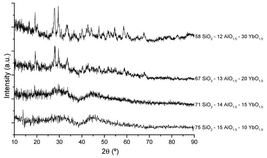 X-ray diffraction patterns of sol-gel derived Yb-doped aluminosilicate bulk samples, heat treated at 1050 °C.