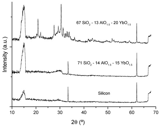 X-ray diffraction patterns of silicon and two aluminosilicate films with 15 and 20 mol% YbO1.5, heat treated at 1100 °C.