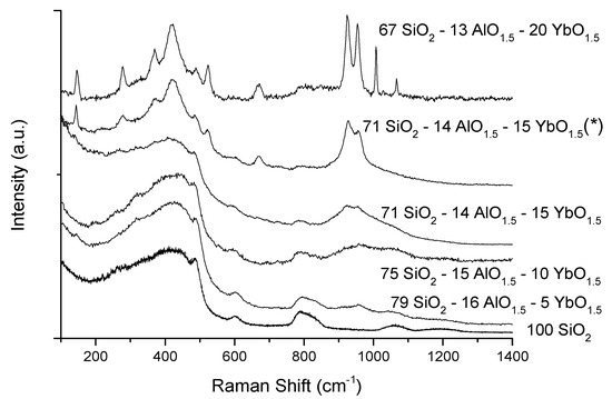 Raman spectra of Yb-doped aluminosilicate bulk glasses. The samples were heat treated at 1050 °C, except for the sample labelled (*) which was heat-treated at 1100 °C.
