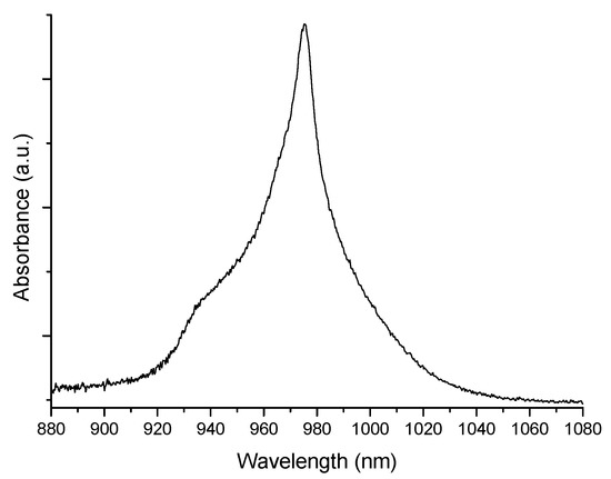 Yb3+ ion absorption was measured in the near infrared (NIR), for both aluminosilicate and phosphosilicate monolithic gels. The Yb3+ ion is known to absorb at wavelengths near ~975 nm, due to the 2F7/2 → 2F5/2 transition starting from the ground state, with a shoulder near ~940 nm [14]. Figure 4 shows the Yb3+ absorption spectrum for the 79 SiO2-16 AlO1.5-5 YbO1.5 bulk gel sample, before heat treatment, when it was still monolithic and transparent.