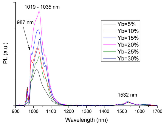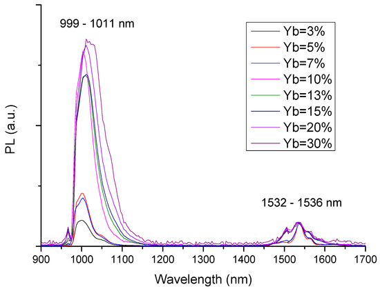 In Figure 5, two main peaks can be observed for the phosphosilicate glasses at 999–1011 and 1532 nm, representing Yb3+ and Er3+ PL emissions due to 2F5/2 → 2F7/2 and 4I13/2 → 4I15/2, respectively. The Yb3+ PL peak position varied with the Yb content between 999 nm (for 3 mol% Yb) and 1011 nm (for 30 mol% YbO1.5). The normalization at 1532 nm revealed a general increase in the PL peak intensity with increasing Yb content. A residual peak is also observed at 970 nm, due to the incompletely filtered excitation laser light.