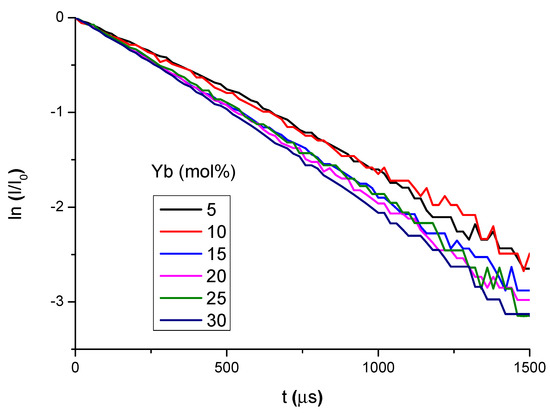 PL decay curves of aluminosilicate bulk glass samples doped with 5–30 mol% YbO1.5.