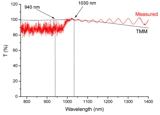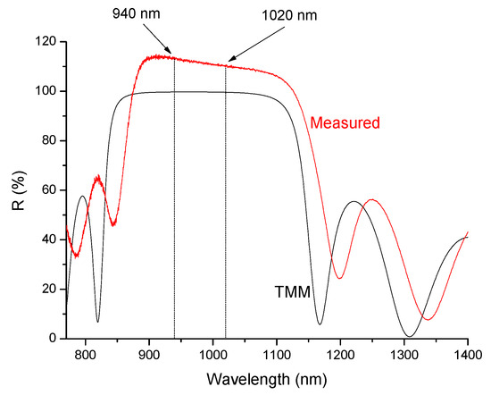 Figure 8 compares a BM reflectance measurement with its TMM simulation, while Figure 9 compares the transmission of the ARC with the corresponding TMM simulation. In the former case, high reflectivity is observed at both the 940 nm and the 1020 nm wavelengths; the observed values were slightly higher than 100%, since the BM reflected more than the Al mirror used as reference. In the latter case, the transmission is near 100%, evidencing the ARC properties and the interference fringes are due to the ARC thickness the agreement between theory and experiment appears reasonably good in both cases.