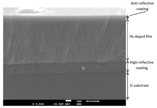 An active disk doped with 15 mol% YbO1.5, whose structure consisted of a 7-pair BM, an active layer with molar composition 71 SiO2-14 AlO1.5-15 YbO1.5 and a 3-layer ARC, deposited on single-crystal silicon, was observed by scanning electron microscopy (SEM) and Figure 10 shows the corresponding cross-sectional image. This active disk had an overall thickness of ~10 μm. In the highly reflective portion, it is possible to distinguish the individual BM layers, for a total of seven high/low index pairs. In addition, the fracture surface of the Yb-doped portion is typical of an amorphous material, without any visible grains at this magnification.