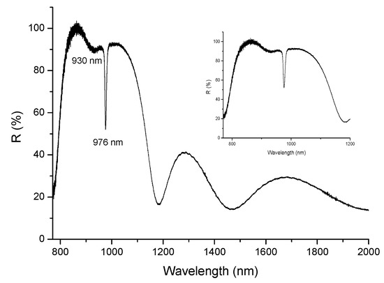 The reflectance of the same active disk was measured in the NIR region (Figure 12) and a broad stop band of high reflectivity is visible over the range of ~750–1200 nm, due to the BM. A reflection-absorption effect is also observed at ~900–1000 nm, due to the Yb3+ absorption within the active layer.