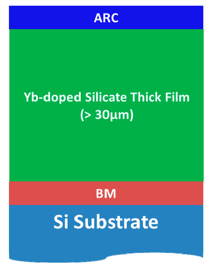 - Ribeiro, T.V.; Santos, L.F.; Gonçalves, M.C.; Almeida, R.M. Heavily Yb-doped silicate glass thick films. J. Sol-Gel Sci. Technol. 2017, 81, 105–113. [Google Scholar] [CrossRef]