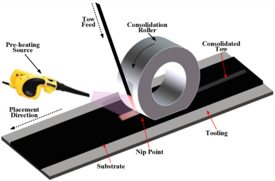 A popular type of prepregs are laminated and then cured to be fiber-reinforced composites [1,2,3,4], which have a number of advantages in comparison to metal-based structures, including the fact that they offer lightweight and stiff surfaces, which resist corrosion well and are also believed to have a relatively long fatigue life [5]. Hence, composite materials are now increasingly used as large and complex primary structures in aeronautics industry. However, their well-known manufacturing weaknesses, such as pores and micro-crack, drive many companies to develop new methods to obtain better part quality. The recent introduction of airplanes with parts made by the Automated Fiber Placement (AFP) process has increased the demand for this method. An AFP machine consists of a computer controlled robotic arm with a placement head end effector that lays bands of prepreg strips onto a mold to construct the lay-up. The bands are made with 8–32 prepreg strips, called tows, which are aligned side-by-side by the placement head. For each ply, the machine accurately places the bands on the mold respecting the proper ply angles and covering technique. The part is then placed in an autoclave to polymerize the resin material and consolidate the plies [6]. The Automated Fiber Placement process is shown in Figure 1.