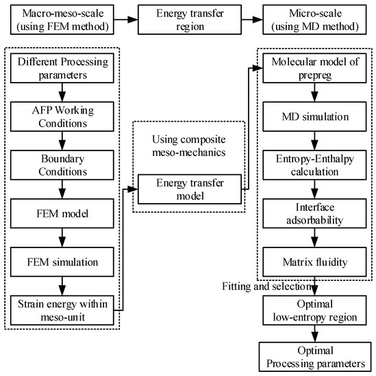 Based on concurrent/sequential multi-scale analysis method [26], energy transfer model, finite element method and Molecular Dynamics (MD) method, a multi-scale low-entropy design method is proposed, as shown in Figure 2, which is also the general idea in this paper. This method is applicable for band-shape structure of prepreg.