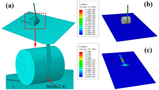 FEM model is established (Figure 3) in this study, which includes roller, prepreg tow and laminates in high-speed AFP. The laying speed is set as 27 m/min, 30 m/min, 33 m/min and 36 m/min, respectively. The compaction force is considered to be 150 KPa, 200 KPa, 250 KPa and 300 KPa, respectively. The levels of laying speed and compaction are cross-linked, thus 16 groups of boundary conditions could be obtained. In this study, the simulation time is set to be 125 μs. The bottom of laminates, which are formed by four unidirectional layers, is fully constrained. In addition, the actual length of lay-up tow is 280 mm, and contact type is set as rough between the laying tow and the laminates. To analyze the meso-mechanical characteristics of a unit in the laying tow, mesh(2,4) is chosen to serve as an analytical object that draws in Figure 3a. Partial results are shown in Figure 3b,c.