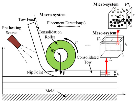 Material properties have a multi-scale effect, which is no exception for composites fabricated by AFP. On the one hand, the formation and expansion process of manufacturing defects for prepreg have the multi-scale effect in AFP, which is a “long” creep process and includes different spatiotemporal scales [7]. This statement also works from the physical point of view that cracks form at the atomic scale, extend to the macroscopic level, are irreversible, and travel far from equilibrium [8]. On the other hand, mechanical properties also have the multi-scale effect during AFP process. Small-scale mechanical behaviors are the latent phenomenon of large-scale performance. However, small-scale mechanical properties cannot be completely reflected in large-scale performance that could be measured traditionally. Unfortunately, these multi-scale problems remain a compelling challenge until now [9,10,11,12,13,14]. Although much research has been done on the mechanical properties of composites during service life [15,16,17], little work focuses on the one under different scales during AFP process.