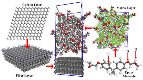 The micro-system is uniformly heated without taking heat conduction and thermal diffusion into consideration, and pre-heating factor is increased in the micro-system. Some experiences show that the highest pre-heating temperature about 350 K or so may be applied in epoxy resins. Thus, the pre-heating temperature is set as 313.15 K, 323.15 K, 333.15 K and 343.15 K respectively. Then the 64 groups of MD simulation parameters can be obtained by linking to the 16 groups of FEM conditions. Strain energy in roll nip aimed at mesh(2,4) are extracted to input the micro-system through energy transfer model (Equations (2), (3) and (5)). It explains specifically that the energy of micro-system is converted into pressure, and then the pressure can be inputted to x, y, and z directions using system pressurization method. Roller pressure (i.e., compaction force) is exerted to the z direction simultaneously. MD simulation time is set to 30 ps because the micro-system has been stabilized through relaxation process. The adsorption process of carbon fiber to epoxy resin is shown in Figure 6.