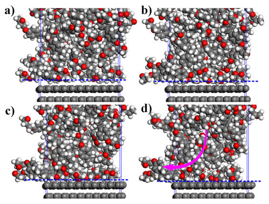The adsorption process at the compaction force of 300KPa, the laying speed of 30 m/min and the pre-heating temperature of 333.15 K: (a) 0 ps; (b) 10 ps; (c) 20 ps; and (d) 30 ps (the arrow refers to the adsorption direction).