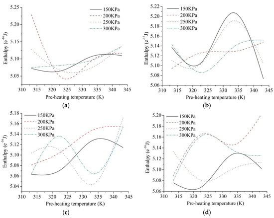 Figure 7a shows that the trends of enthalpy curves are from low to high with the rise of pre-heating temperature at a higher laying speed. In Figure 7b–d, most enthalpy curves have two inflection points with the rise of pre-heating temperature at the laying speed of 33 m/min, 30 m/min and 27 m/min, which could affect the variation trend of enthalpy. We also find that the internal energy of micro-system could not be improved with the increase of laying speed. Taken as a whole, the effect of pre-heating temperature and compaction force on the enthalpy is irregular, which indicates that there is a strong coupling interrelation among different processing parameters.