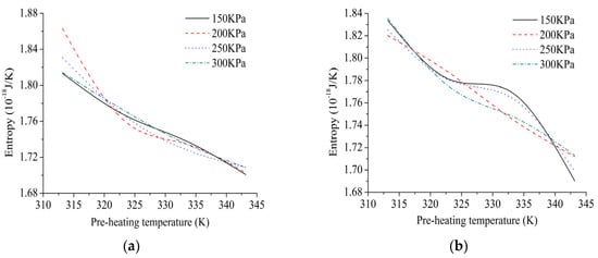 In Figure 8, effect of pre-heating temperature on the entropy of micro-system is more significant compared with laying speed and compaction force. The relationship between pre-heating temperature and the entropy could exhibit negative correlation. In other words, the higher the pre-heating temperature is, the lower the entropy is. Higher energy utilization efficiency and better energy quality could be realized at higher level of pre-heating temperature. The possible reason is that external heat source has done a reversible power to the system or exothermic process is driven during movement process. Therefore, in processing optimization, pre-heating temperature could be set to increase as much as possible within a reasonable range, which would guarantee low-entropy of micro-system for the laying tow. The result suggests that effect of compaction force and laying speed on the entropy could be ignored regarding the design of low-entropy, where only a single variable is considered.