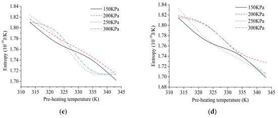 The fittingcurves of entropy under different processing parameters: (a) 36 m/min; (b) 33 m/min; (c) 30 m/min; and (d) 27 m/min.