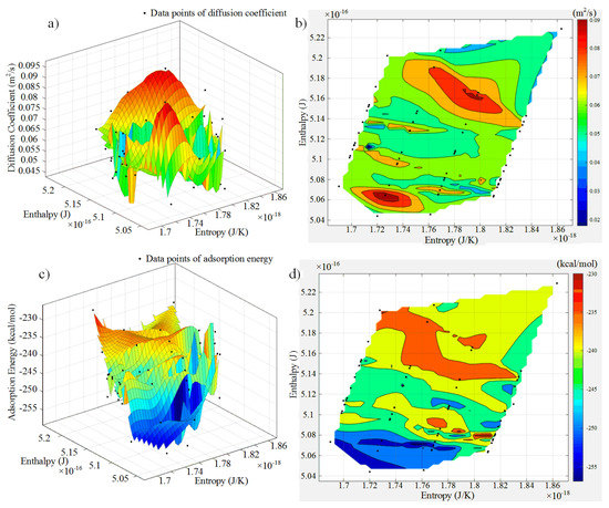 Relational surfaces and contour maps of micromechanics variables with enthalpy–entropy: (a) relational surface of diffusion coefficient with enthalpy–entropy; (b) contour maps of diffusion coefficient with enthalpy–entropy; (c) Relational surface of adsorption energy with enthalpy–entropy; and (d) contour maps of adsorption energy with enthalpy–entropy.