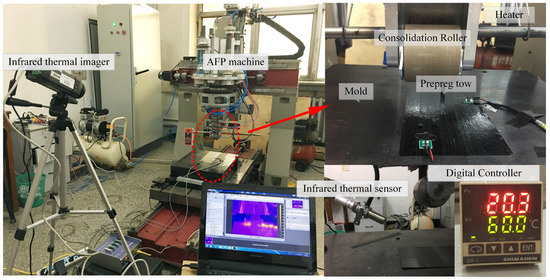 Gantry-type four-axis automated fiber placement machine is applied in the experiments, which is capable of automatic shearing, clamping and re-feeding for the prepreg tows. The precise control of pre-heating temperature required building a temperature control system that forms a temperature feedback and control loop through infrared probe (the range of 0–300 °C), relay, air switch and heater. Experimental AFP machine and other equipment are shown in Figure 10.