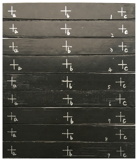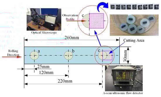 The attenuation rate of three testing points, a, b and c, are measured by A-scan ultrasonic testing after curing. The off-line detection method, that is, photographic method by optical microscope, is used to quantify the void content of point c. The relationship between the void content and the attenuation rate is then gained. Thus, the other two testing points after curing could be estimated according to the attenuation rate. The average value of three points is used to evaluate the entire void content of the laminates before curing. One of the more accurate off-line defect detection methods is photographic method by optical microscope, which can detect the defect rate value less than 0.5%.In this paper, this method is used as the experimental calibration method. The c point is cut, and the detection profile is polished. Six fields of view are found under the microscope that observes in the profile of each sample. As the defects present dark, the gray value is marked by Image-pro, and the void content is further calculated. The average void content of the six fields of view is used to evaluate the true void content at point c. The nine groups of laminates after curing are shown in Figure 11.