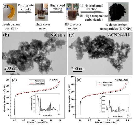 (a) Description of process from fresh banana peels to porous carbon. TEM images of (b) N-CNPs and (c) N-CNPs-NH3. Nitrogen sorption isotherms and the corresponding pore size distributions of (d) N-CNPs and (e) N-CNPs-NH3.
