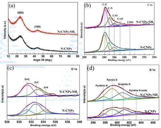 (a) XRD patterns of the N-CNPs and N-CNPs-NH3 samples. High-resolution XPS spectra. (b) C 1s; (c) O 1s; and (d) N 1s bands of N-CNPs and N-CNPs-NH3.
