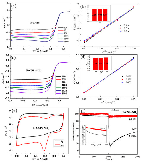 In order to investigate the role of nitrogen doping and the spherical morphology of N-CNPs-NH3, relevant ORR electrochemical tests were carried out in N2/O2 saturated 0.1 M KOH solutions using the rotating disk electrode (RDE) method. The reaction kinetics of N-CNPs and N-CNPs-NH3 were evaluated via an ORR polarization method at different rotation speeds (Figure 3a,c). The Koutecký–Levich (K–L) plots of both samples (Figure 3b,d) showed a approximately linear relationships between j−1 and ω−1/2. The average values of the electron transfer number (n) values of N-CNPs (Figure 3b) and N-CNPs-NH3 (Figure 3d) were estimated from the K–L plots within the potential ranges of 0.45–0.55 and 0.4–0.6 V, respectively. The n values of N-CNPs-NH3 for the ORR were 3.44, 3.49, and 3.56, thereby revealing a four-electron reaction pathway (see inset of Figure 3d). In contrast, N-CNPs exhibited n values of 2.95, 3.02, and 3.11, suggesting a combination of two-electron and four-electron reaction pathways (inset of Figure 3b). The The cyclic voltammetry (CV) and linear sweep voltammetry (LSV) results allowed us to conclude that the spherical surface, nitrogen doping, and high SSA characteristics of N-CNPs-NH3 were responsible for the superior electrocatalytic properties of this sample [1]. To evaluate the electrocatalytic activity of N-CNPs-NH3, CV measurements were carried out (Figure 3e). N-CNPs-NH3 showed an noticeable oxygen reduction peak in O2-saturated 0.1 M KOH solutions, whereas this peak was not observed in the case of N2-saturated solutions.