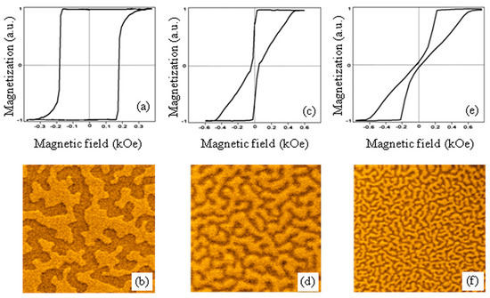 As can be seen from Figure 1b, the typical lateral size of magnetic domains is about 1 μm. The additional Co capping layer changes the domain structure considerably. The hysteresis curve and MFM image for Co/Pt structure with 1 nm Co capping layer are represented in Figure 1c,d. In this case, we observe the narrowing of the hysteresis loop (the remanent magnetization is 0.8 M0 and the coercive field is 50 Oe) and a reduction in the size of the domains (typical width is about 350 nm). In the case of the 1.3 nm Co capping layer, the remanent magnetization is 0.2 M0, the coercive field is 10 Oe and the typical domain width is 150 nm. The decrease of the domain structure scales with increasing thickness of the Co capping layer can be explained by effects of exchange interaction. The Co-Co/Pt exchange coupling leads to a decrease in the effective perpendicular anisotropy, and to an increase in the density of the domain walls in the Co/Pt subsystem. Similar effects of changes in the domain structure were mentioned in [18], where Co/Pd structures with a NiFe capping layer were studied.