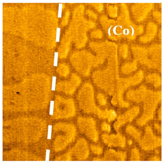 The MFM image of domain structure in demagnetized state of Co/Pt-Co (1 nm) sample near the edge of Co (1 nm) capping layer (Co capping layer is on the right side). The border between Co/Pt and Co/Pt-Co structures is shown by a dashed line. The MFM frame size is 4 μm × 4 μm. The MFM contrast is normalized to the maximum.