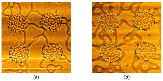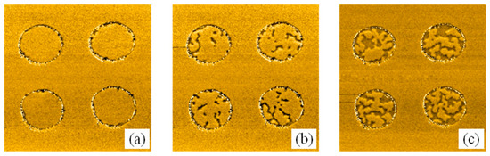 Initially, the sample was uniformly magnetized in an external field of 500 Oe. The MFM image of the initial state is shown in Figure 3a. The contours of the discs are visible due to the influence of the edge relief on the MFM image. The magnetization reversal of this sample occurred in two stages. In the first stage (in the fields less than the CoPt coercive field of 200 Oe), we observed the remagnetization of the regions of Co/Pt under the Co disks (Figure 3b,c). At the second stage, in the fields exceeding 200 Oe, the magnetization was reversed outside the discs (Figure 4a,b).