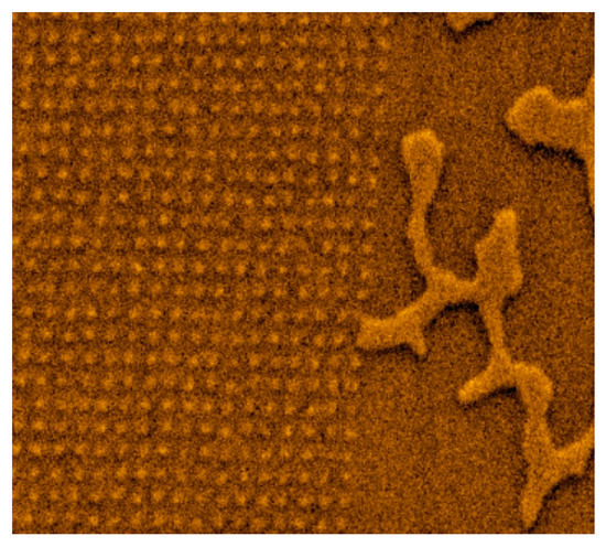 We investigated Co/Pt film with an array of locally irradiated spots of 100 nm in diameter, ordered in a square lattice with a 200 nm period. The domain structure of the Co/Pt sample (in demagnetized state after applying a 200 Oe reversed magnetic field) near the boundary between the irradiated and unirradiated regions is shown in Figure 6.